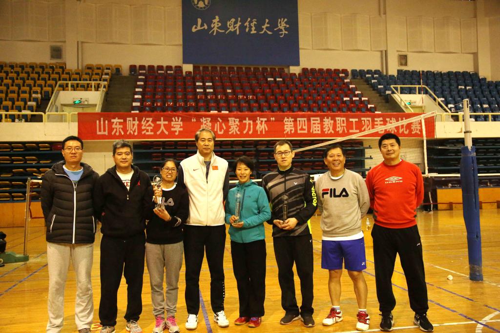 11月23日,由校工会主办,体育学院承办的山东财经大学教职工“凝心聚力”杯第四届羽毛球比赛圆满落幕。我院代表队力克群雄,荣获团体冠军,并取得男子单打冠军和女子单打亚军的优异成绩。