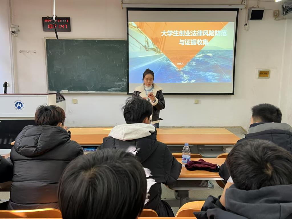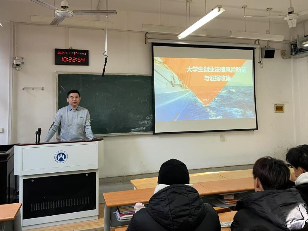 为了提升我院学生的法律意识,帮助他们了解创业过程中可能面临的法律风险,并提供实用的法律知识和证据收集方法,11月27日上午,体育学院在舜耕校区2207教室举办了以“大学生创业法律风险防范与证据收集”为主题的讲座。本次讲座特邀济南济尔达信息科技有限公司董事长于大力主讲,2022、2023级部分学生参加。讲座由学院就业办主任刘天姿主持。
