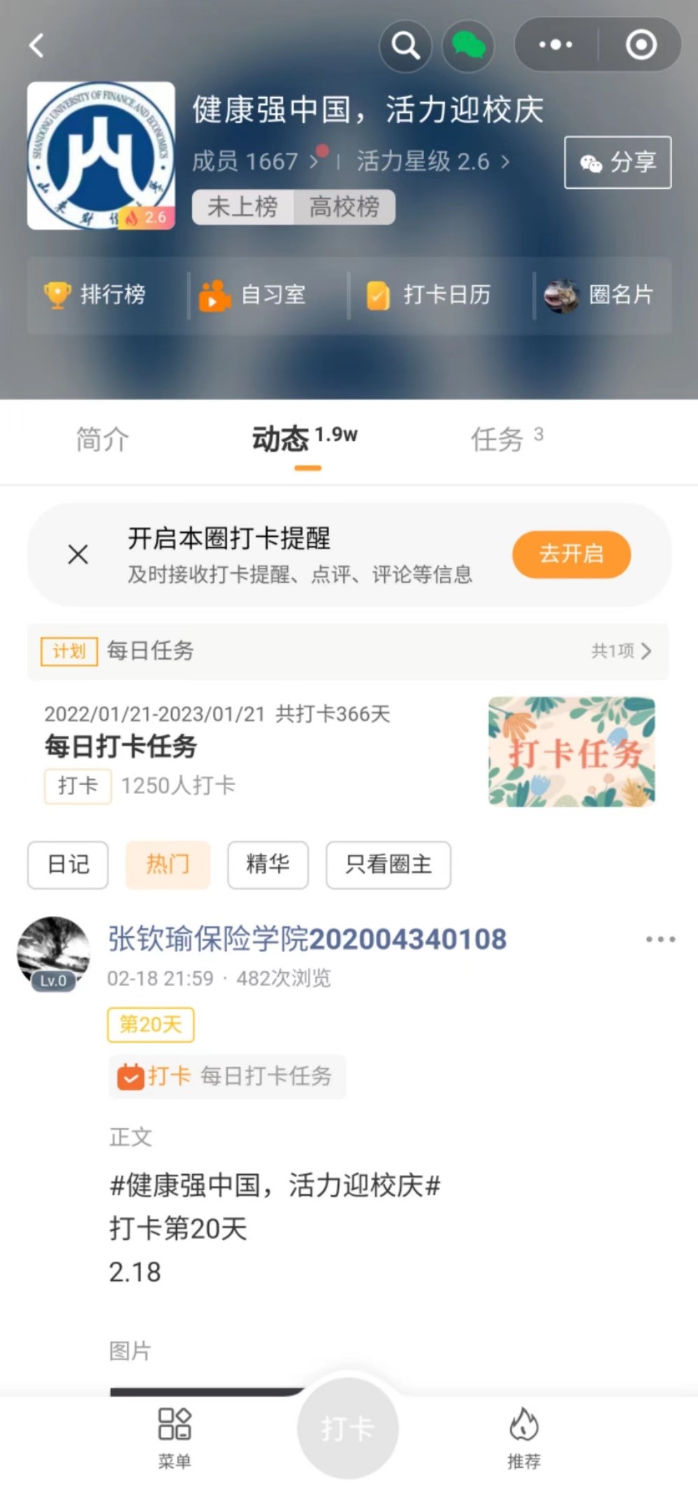 本次打卡活动旨在增强学生体质,活跃校园体育文化生活,深入开展了教育部"亿万学生阳光运动"的活动,掀起全校学生体育锻炼的热潮,可以让我们以饱满的精神面貌庆祝山东财经大学70年校庆。希望以后可以多开展此类活动,我一定会积极参与的。