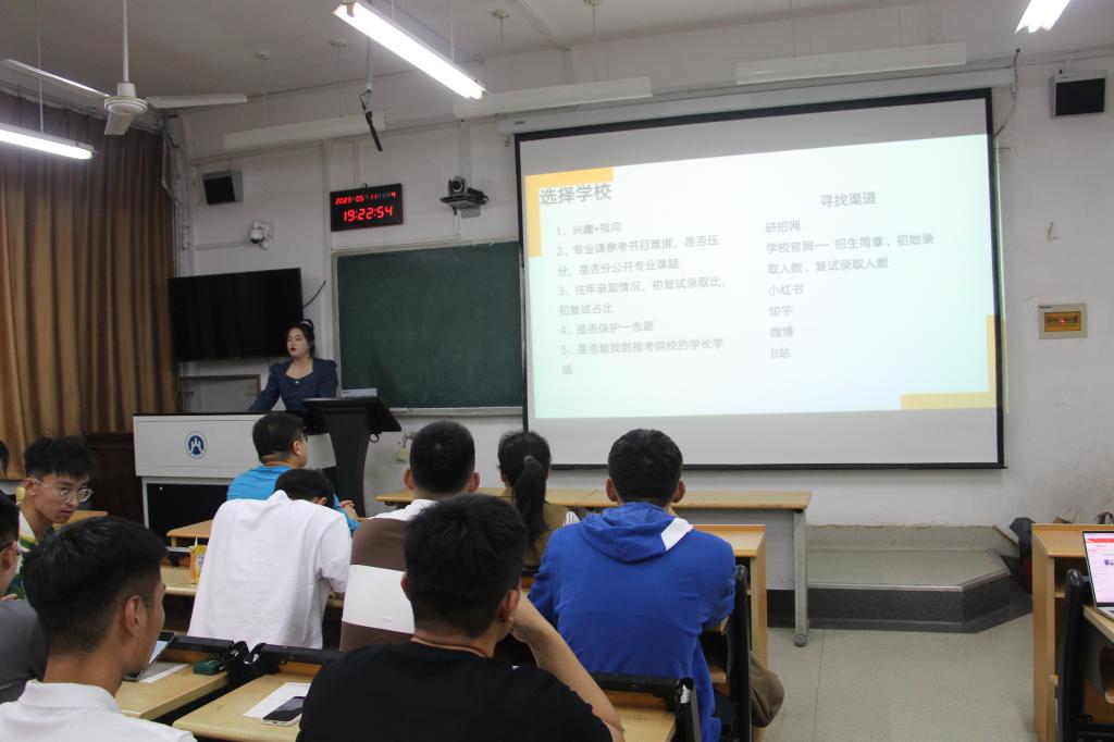 经验传承促交流,优秀学子立榜样。八名优秀毕业生结合自身考研经历实际,围绕报考院校和专业的选择、备考计划的制定、各考试科目的学习方法、自身心态的调整等方面开展生动分享和交流。他们针对即将考研的同学提出了宝贵的建议:首先,要对自身综合能力有全面清晰的认知,明确自身客观优势,在择校、选报专业时脚踏实地,切勿盲目锁定目标;其次,要找到适合自己的学习方法,夯实基础的同时掌握技巧,针对不同科目有意识开展对症下药,从而全面提升学习效率;最后,他们提出考研是一场持久战兼心理战,希望学弟学妹们学会及时调整心态、确保不受外界因素干扰,保持良好的学习状态和积极的心理状态,实现考研成功上岸。