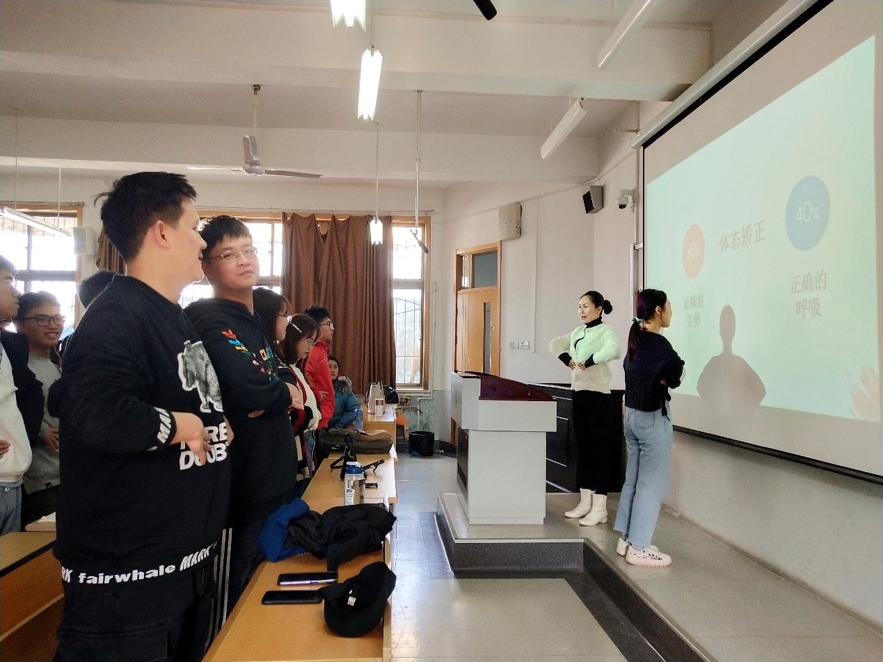 演讲过程中,朱老师为大家讲解了体态方面的静态与动态评估,传授了“葫芦娃”矫正体态法,倡导大家及时体检、重视心理健康等,引导同学们养成良好的生活作息。为了让大家参与其中,朱老师更是亲自上阵示范胸式呼吸和正确站姿,这让同学们以更生动的方式去学习如何塑造良好的体态。随后,同学们都主动上台参与教学示范,体验正确呼吸的方法,讲座现场气氛非常活跃。