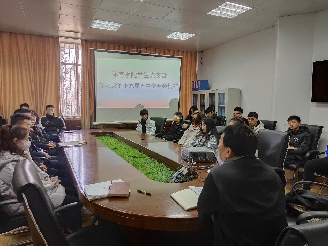12月16日,学生党支部在舜耕体育馆会议室集体学习党的十九届五中全会精神,全体学生党员、入党积极分子参加学习。学习由学生党支部书记刘洪超主持,学院党委副书记汤长胜带领学习。