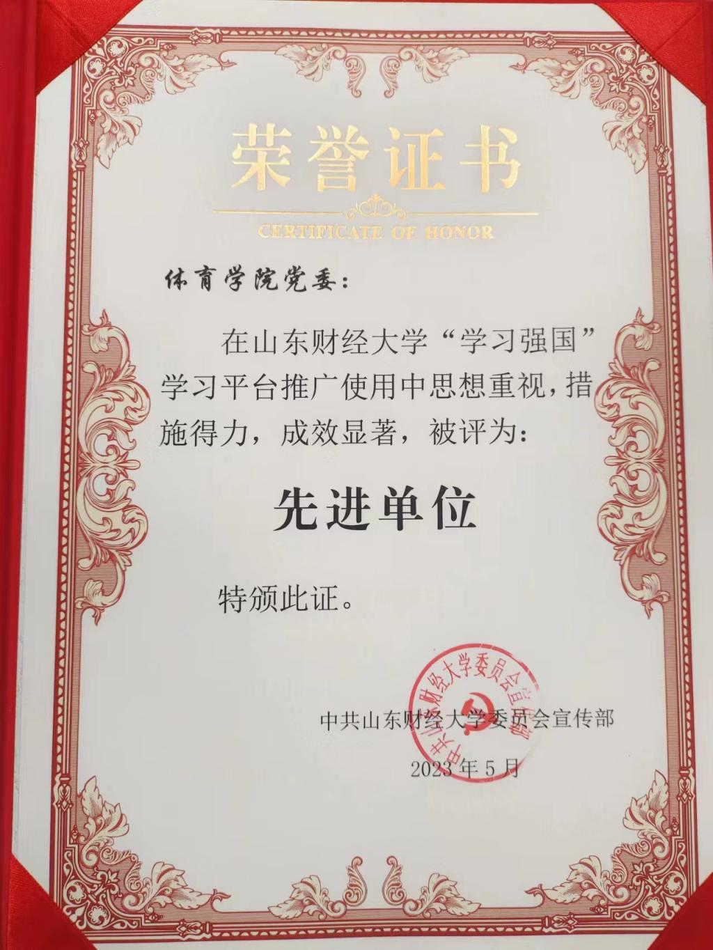 在本次评优表彰活动中体育学院党委被评为“学习强国”学习平台先进单位,王猛和孙锋同志被评为“学习强国”先进个人。自2019年“学习强国”学习平台上线山东财经大学各单位以来,体育学院党委高度重视“学习强国”推广使用、建立完善的学习管理运行机制,学习管理措施得力,学习氛围浓厚,广大党员群众积极参与,党员注册使用率、学习参与度、人均积分等指标排名前列。为全面贯彻党的二十大精神、深入开展学习贯彻习近平新时代中国特色社会主义思想主题教育,充分发挥了“学习强国”学习平台的学习载体作用。