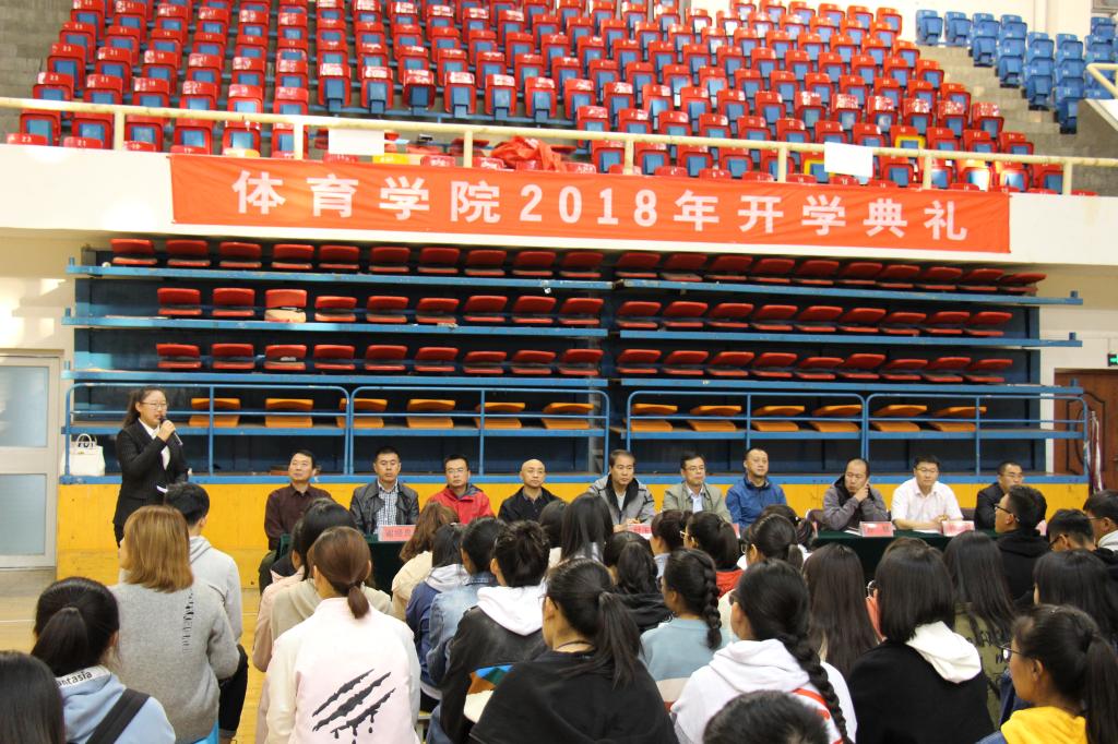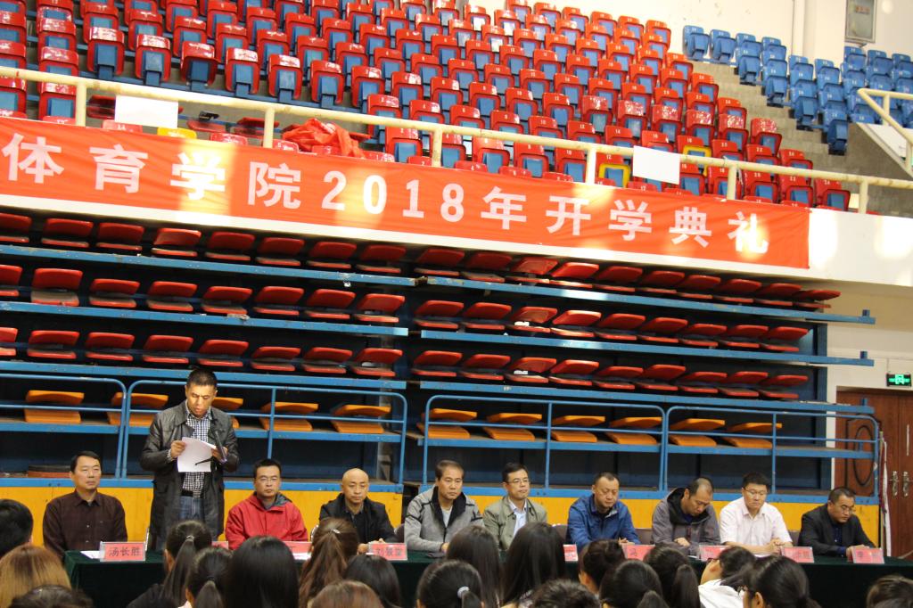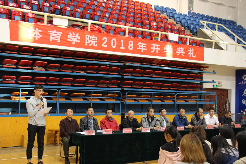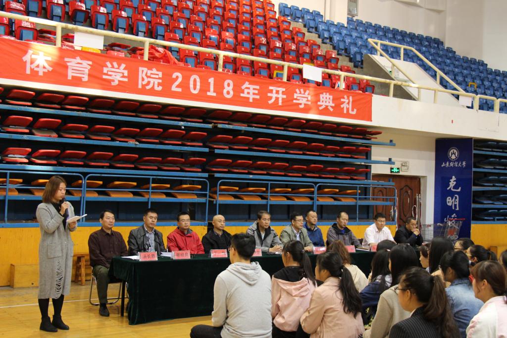 10月11日下午,山东财经大学体育学院2018级新生开学典礼在舜耕校区体育馆隆重举行。体育学院院长付玉坤,党委书记武方安,副书记汤长胜,副院长刘景堂,副院长冯兵,体育经济与管理系系主任丁伟,社会体育指导与管理系主任孙锋,实验中心主任谢经良,学院团委书记刘洪超,就业办主任李刚出席典礼。参加开学典礼的还有2018级全体新生。典礼由党委副书记汤长胜主持。