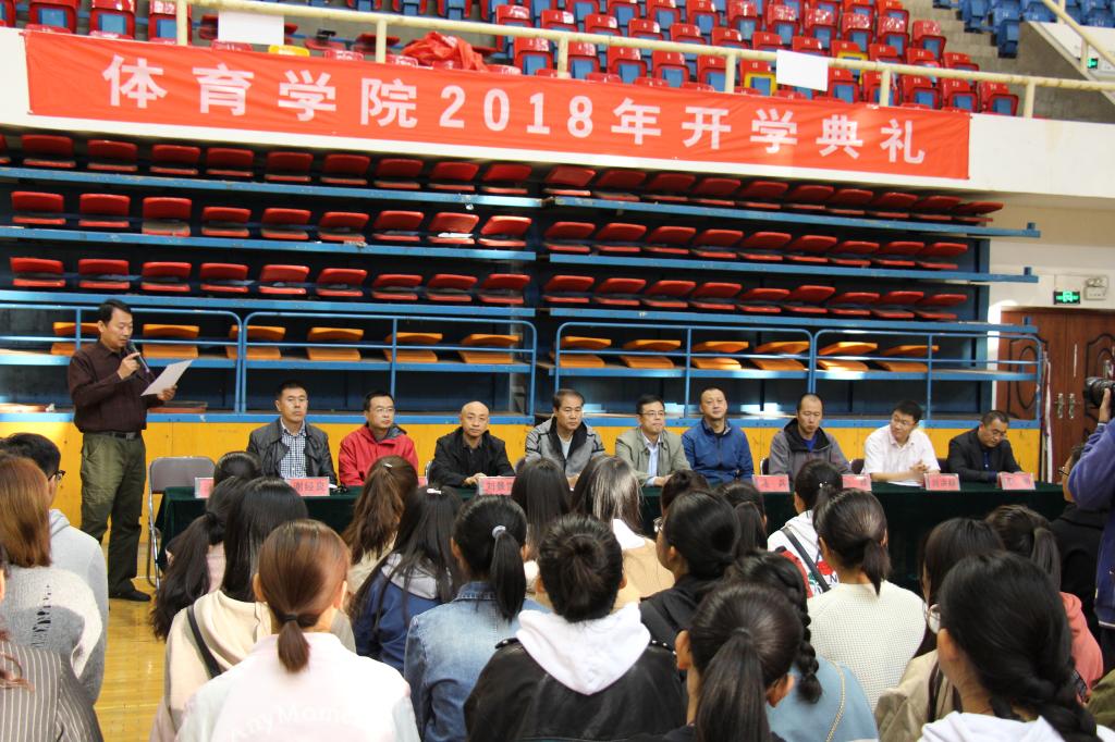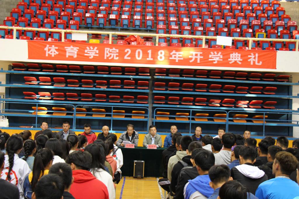 典礼正式开始后,付玉坤院长发表讲话。付院长首先对2018级新同学的到来表示衷心的祝贺和热烈的欢迎,对含辛茹苦的学生家长们表示由衷的感谢和诚挚的问候。他介绍了18级新生的总体情况,2018级新生来自于全国15个省(市、自治区)共101人,其中,体育经济专业分为两个班共49人,高水平运动员15人,社会体育与指导专业一个班52人。今年是体育经济与管理专业第一年全国招生,录取分数线高于当地本科线100多分,社体专业最高分552分。学院招收了首届3名体育产业管理研究生,有两名同学退伍回校继续深造。付院长表示,从招生情况可以看出,同学们总体水平高,综合素质强,未来可期。他对体育学院的师资、学科建设、科研、高水平运动队建设等情况作了简要介绍。最后,付院长对18级新生提出了几点希望:第一、不忘初心,继续前行。他要求全院师生要认真学习贯彻全国教育大会精神,提高政治站位,牢固树立“四个意识”,坚定“四个自信”,在习近平新时代中国特色社会主义思想指引下,不忘初心,继续前行。第二、戒骄戒躁、转变角色。希望同学们尽快实现角色转变,找准目标和方向,为了梦想迅速行动。第三、敢打敢拼,勇于创新。他表示,同学们大部分是00后,创新意识强,大家应以德为先,认识自我,追求真理,勇于创新。第四、尊敬师长、团结同学。希望同学们注意点滴养成,确保大学生活的美好和谐。第五、修养身心、全面发展。作为体育学院的一员,希望同学们牢固树立“终身体育”理念,注重身心修养,做一个全面发展的新时代大学生。
