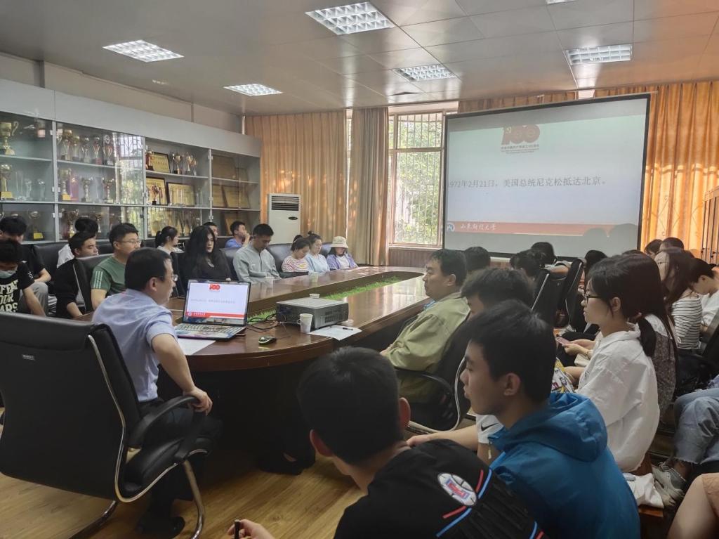 刘宝璋以“从‘尼克松访华’透视‘中国人民站起来的历史飞跃’”为题,回顾了尼克松访华的历史过程,启发大家思考这一历史事件背后的深刻历史原因。尼克松曾说自己这次访问是“改变世界的一周”,不过在毛泽东看来,是世界改变了尼克松。一个个历史镜头、一组组历史数据告诉大家,只有中国共产党领导中国人民完成了新民主主义革命,缔造了中华人民共和国,中国人民才站起来了。新中国成立后,中国共产党带领中国人民筚路蓝缕、以启山林,干成了许多大事好事,完成了很多历史上都没有完成的事。确立了社会主义基本制度;打赢了抗美援朝战争;完成了第一个五年计划;“两弹一星”研制成功;联大表决通过了恢复中华人民共和国的合法席位等等。刘宝璋说,青年学生在党史学习教育中,要明白“是什么、为什么、怎么干”,深刻理解中国共产党为什么“能”、马克思主义为什么“行”、中国特色社会主义为什么“好”等重大理论问题。新时代青年生逢其时,又重任在肩,共产党百年之时,不过而立,共和国百岁之际,不到花甲。他勉励青年学生抓住历史际遇,担当历史重任,找准人生坐标,踏实肯干,善于发展,实现人生价值。