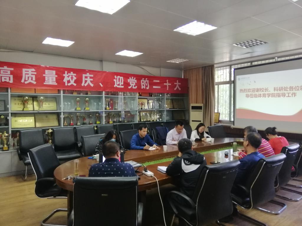 学院党委书记武方安代表学院对谢申祥副校长一行表示热烈地欢迎,对科研处一直以来对体育学院的大力支持表示感谢。副院长李刚对学院师资队伍建设、学科建设、近年来科研情况、科研团队建设以及高水平课题申报等情况进行了汇报。与会领导就科研工作谈了看法,提出了建设性的意见和建议,并就高水平课题申报、期刊论文发表、核心期刊目录等议题进行了深入探讨。