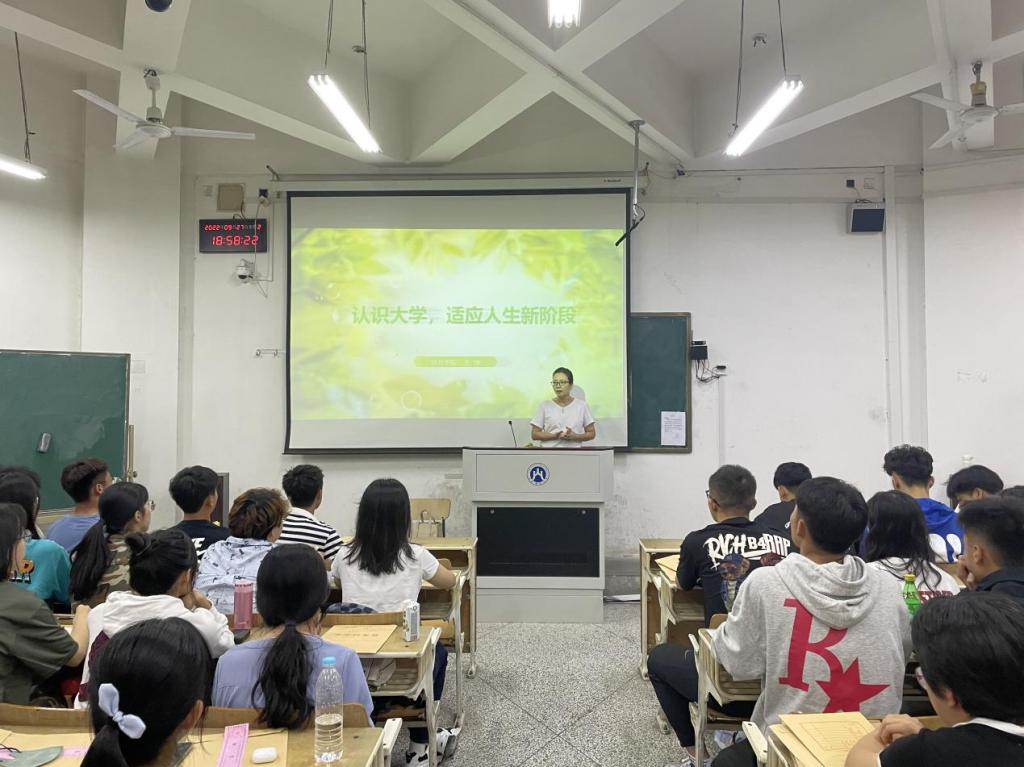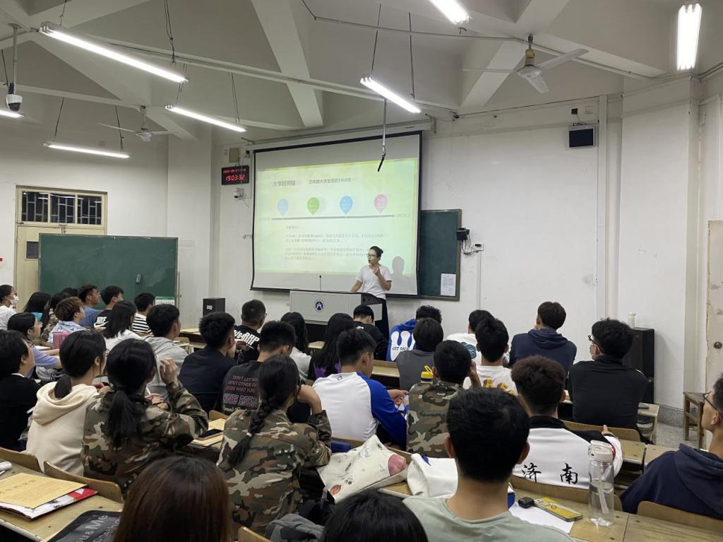 王坤以“认识大学,适应人生新阶段”为主题,从宏观篇、心理篇、能力篇、生活篇等四个角度对新生同学进行了引导和教育。