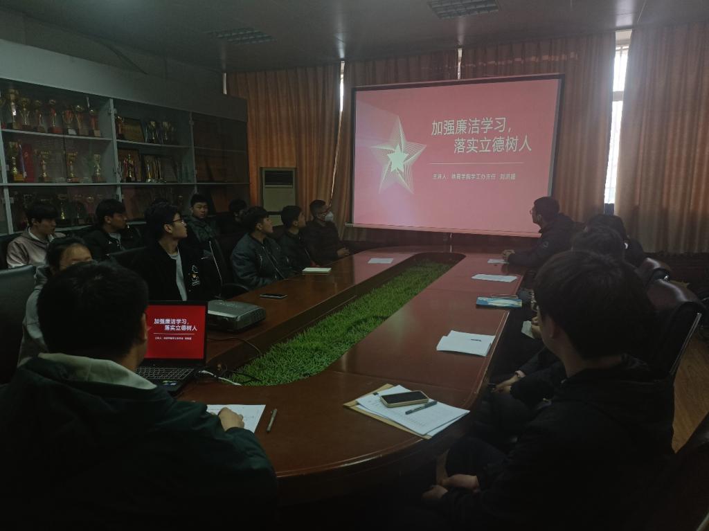 为了落实立德树人根本任务,进一步加强廉洁文化建设,助力大学生养成廉洁自律、诚实守信、文明守法的良好品德,3月24日上午,体育学院在舜耕校区体育馆会议室开展了“青廉课堂”,体育学院学工办主任刘洪超以“加强廉洁学习,落实立德树人”为主题,开展了大学生廉洁教育活动,学生党员和主要学生干部参加活动。