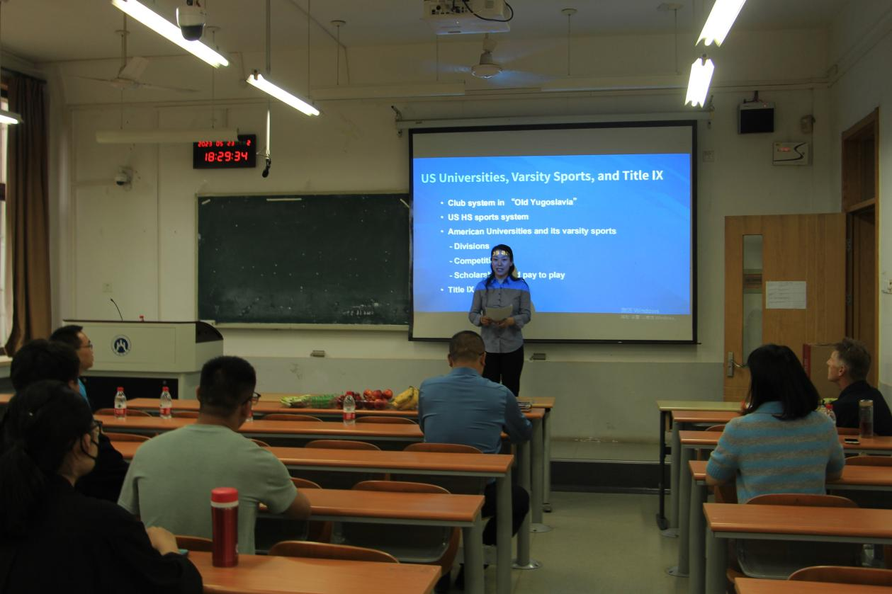 Miren Ivankovic教授先以“旧南斯拉夫“俱乐部制度为例,介绍了国外较为成熟的体育管理制度,引出北美运动员与中国运动员选拔培训机制的不同。他指出美国大学体育比中国大学体育的发展相对成熟,对于比赛、奖学金以及参加比赛的报酬都有明确的规定,但美国的体育管理体系也有自身的不足,俱乐部与运动员收入发配、普通运动员与体育明星之间也充满矛盾。Miren Ivankovic教授的讲座介绍了体育管理的产业现状和国际发展前沿,对我院师生具有知识扩展和启示作用。
