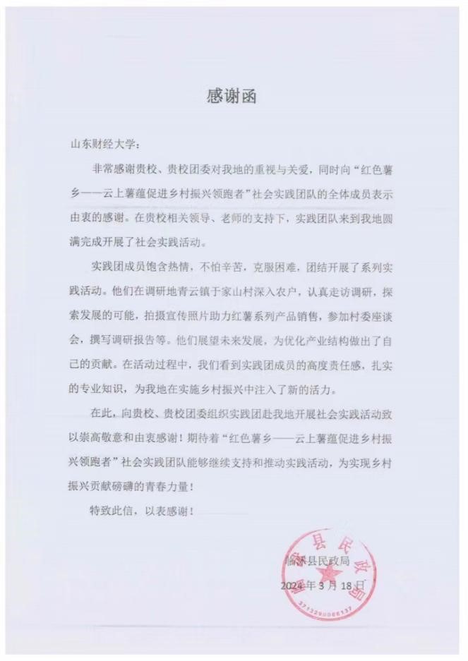 近日,我院收到临沭县民政局发来的感谢信,信中对我院组织的“红色薯乡——云上薯蕴促进乡村振兴领跑者”社会实践团队致以诚挚的感谢,以表彰他们在当地乡村振兴、志愿服务等领域中所做出的积极贡献。此次实践调研活动不仅为当地乡村振兴带来了新鲜的视角和创新的思路,也进一步加深了大学生与乡村之间的紧密联系。