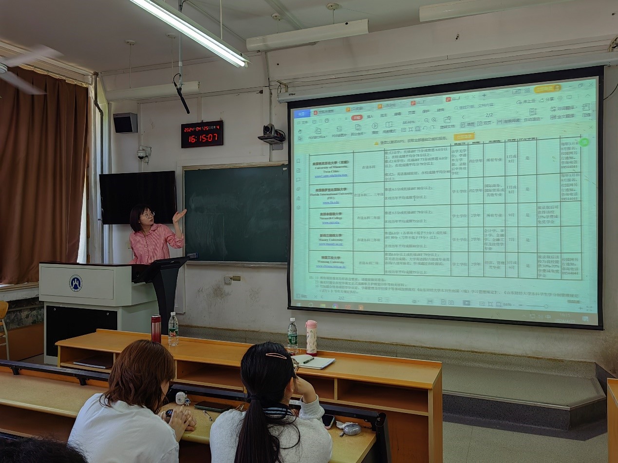 宋晓首先明确介绍了我校国际交流与合作处(港澳台办公室)的主要职责,帮助学生们对该机构的架构和功能有了详细了解。她分享了一些体育学院往届或当前在海外深造学生的成功留学案例,生动地展示了短期交流和访学项目的实际效益,使同学们能够更清晰地看到留学与职业发展之间的直接联系。