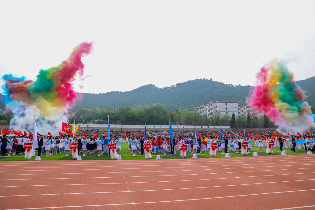 开幕式上,随着庄严的开幕音乐响起,数百只五彩缤纷的气球缓缓升空,象征着体育精神的飞扬和学生们对未来的美好憧憬。紧接着,彩烟在高空中绽放,五彩斑斓的烟雾在蓝天白云下交织成一幅壮观的画卷,为开幕式增添了一抹绚丽的色彩。