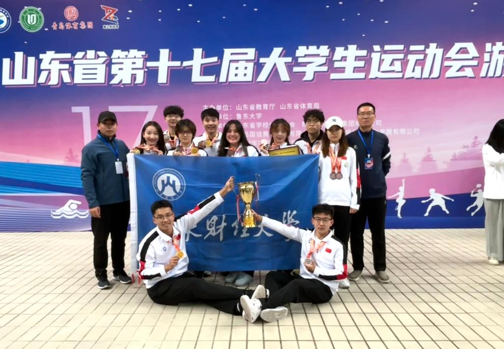 本次比赛设有甲、乙、丙三个组别,吸引了29支代表队的200余名运动员参与。我校游泳队共派出10名运动员参与甲组和丙组的角逐。他们在比赛中展现出了不骄不躁、坚韧不拔、勇往直前、团结协作的精神,充分展现了财大学子的风采。我校代表队以116.5分的好成绩,获得团体总分第三名,位列奖牌榜第二名,创造了我校在省大运会游泳项目上的新纪录,实现了竞技成绩和精神文明的双丰收。甲组的何佳宁、王天泽同学和丙组的吕泠同学凭借出色的表现荣获“优秀运动员”称号。