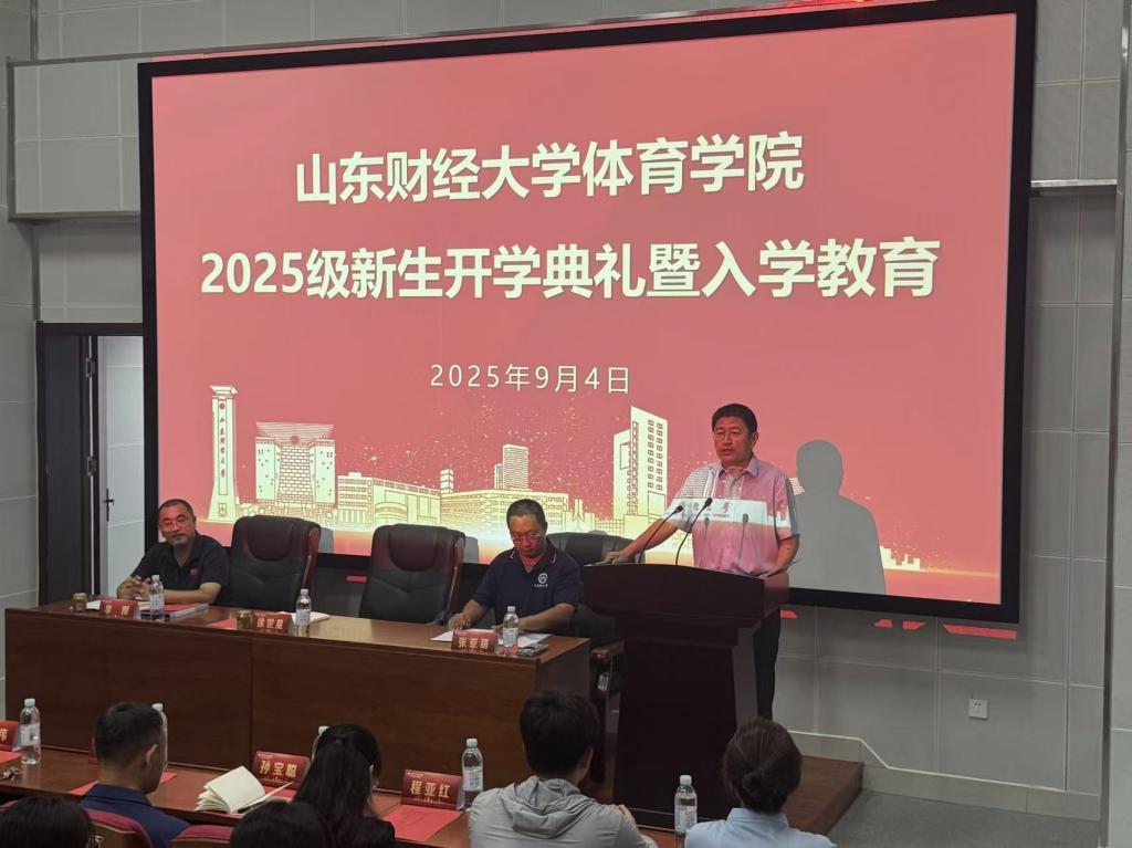 9月4日下午,体育学院2025级新生开学典礼在圣井校区图书馆阶梯教室隆重举行。院党委书记徐世星、院长李刚、院党委副书记张亚萌、系主任孙峰和丁伟、办公室主任孙宝聪、学院辅导员刘天姿、教师代表程亚红以及青年教师蔡捷、刘静轩、丁俊凯等出席典礼,典礼由张亚萌主持,全体25级新生参加。
