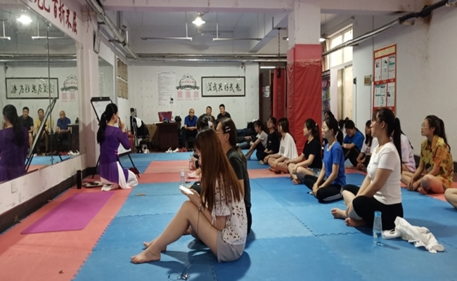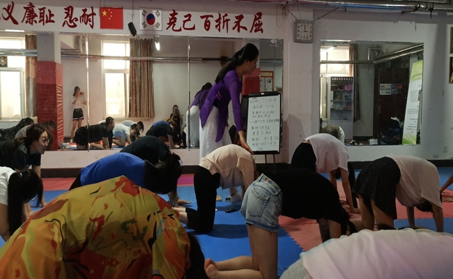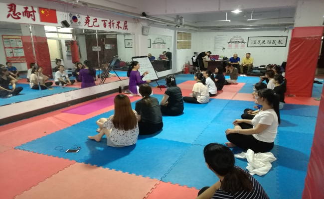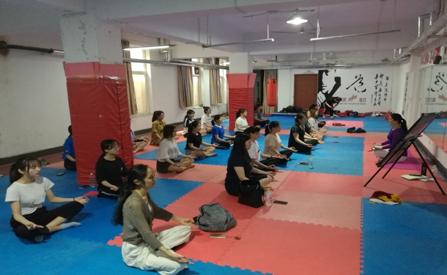 随后,韩秀英老师带领着老师和同学们一起进行瑜伽练习。从训练呼吸方法开始,依次加上腿,手臂,腰等部位上的动作,做到全方位练习。在这个过程中,韩老师除了自己做示范意以外,还指正大家的动作,认真回答大家提出的疑问,让在场的老师和同学们感到受益匪浅。