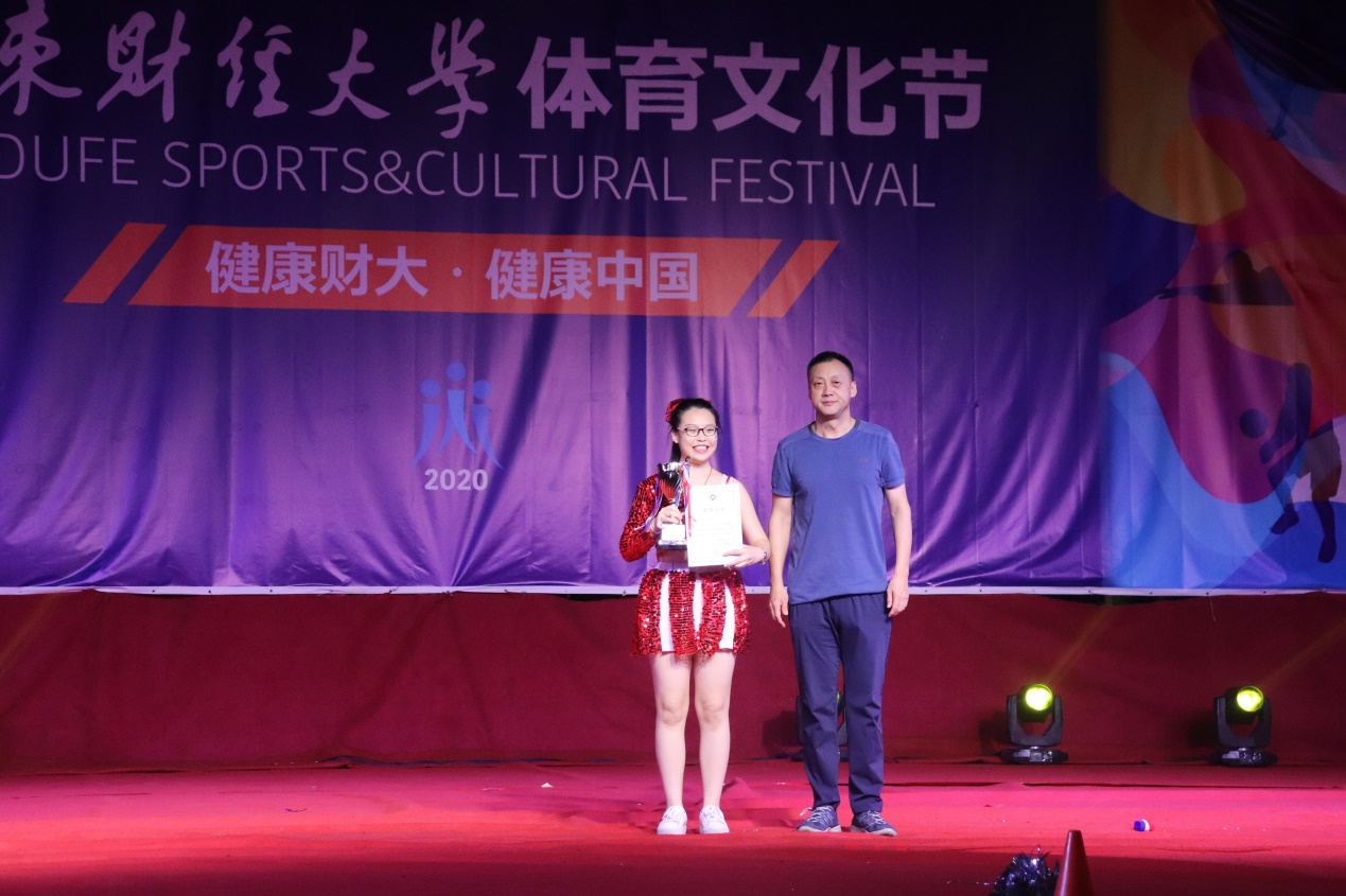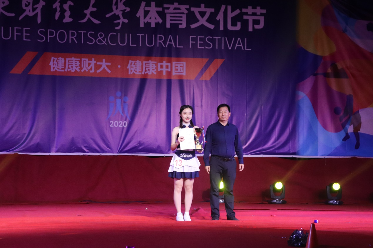 体育学院副院长冯兵为最佳啦啦宝贝奖获得者颁发奖杯证书并合影