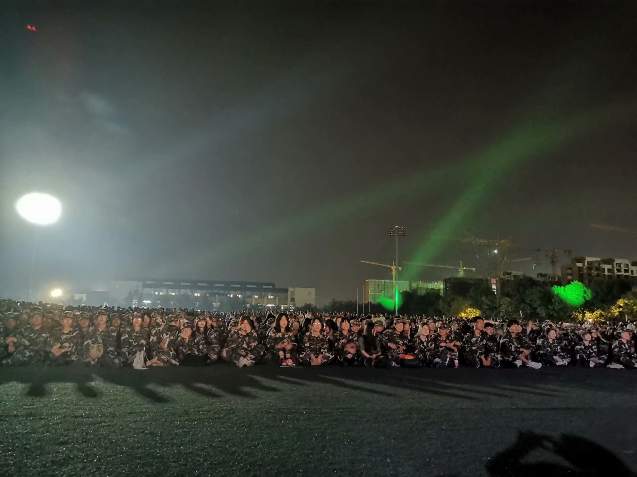 军训的萌新相坐于草地上共同观赏学长学姐带来的啦啦操表演