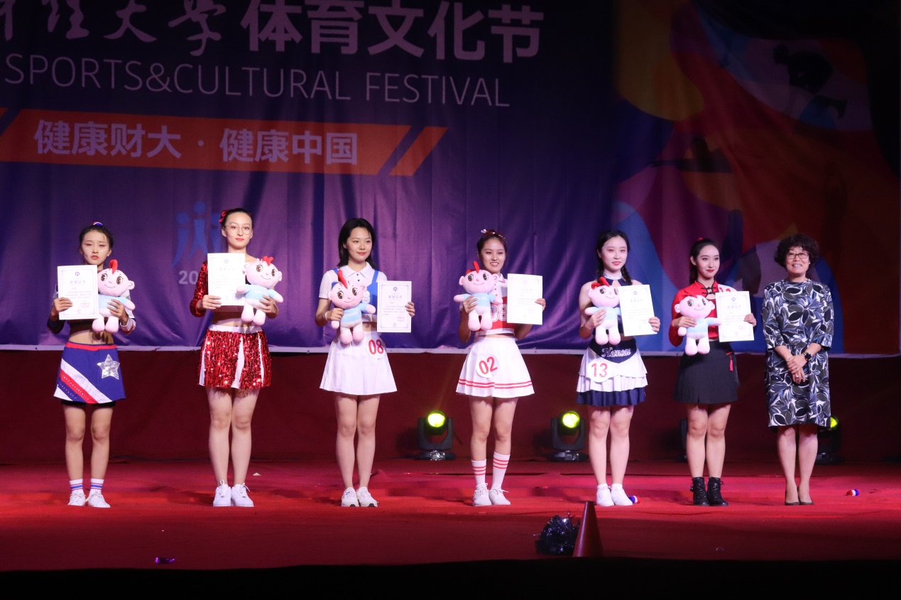 教务处副处长宋保峰为最佳啦啦宝贝奖获得者颁发奖杯证书并合影
