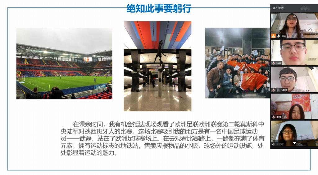 我院2018级硕士研究生黄菲于2019年9月10日至2020年1月20日参加了我校赴俄罗斯普列汉诺夫经济大学的研修交流项目。为了进一步向学院研究生介绍访学经验,开展更多的访学交流,2020年7月13日下午,黄菲同学采用网络视频会议的形式向我院各位研究生同学做了此次访学经历的交流与分享。