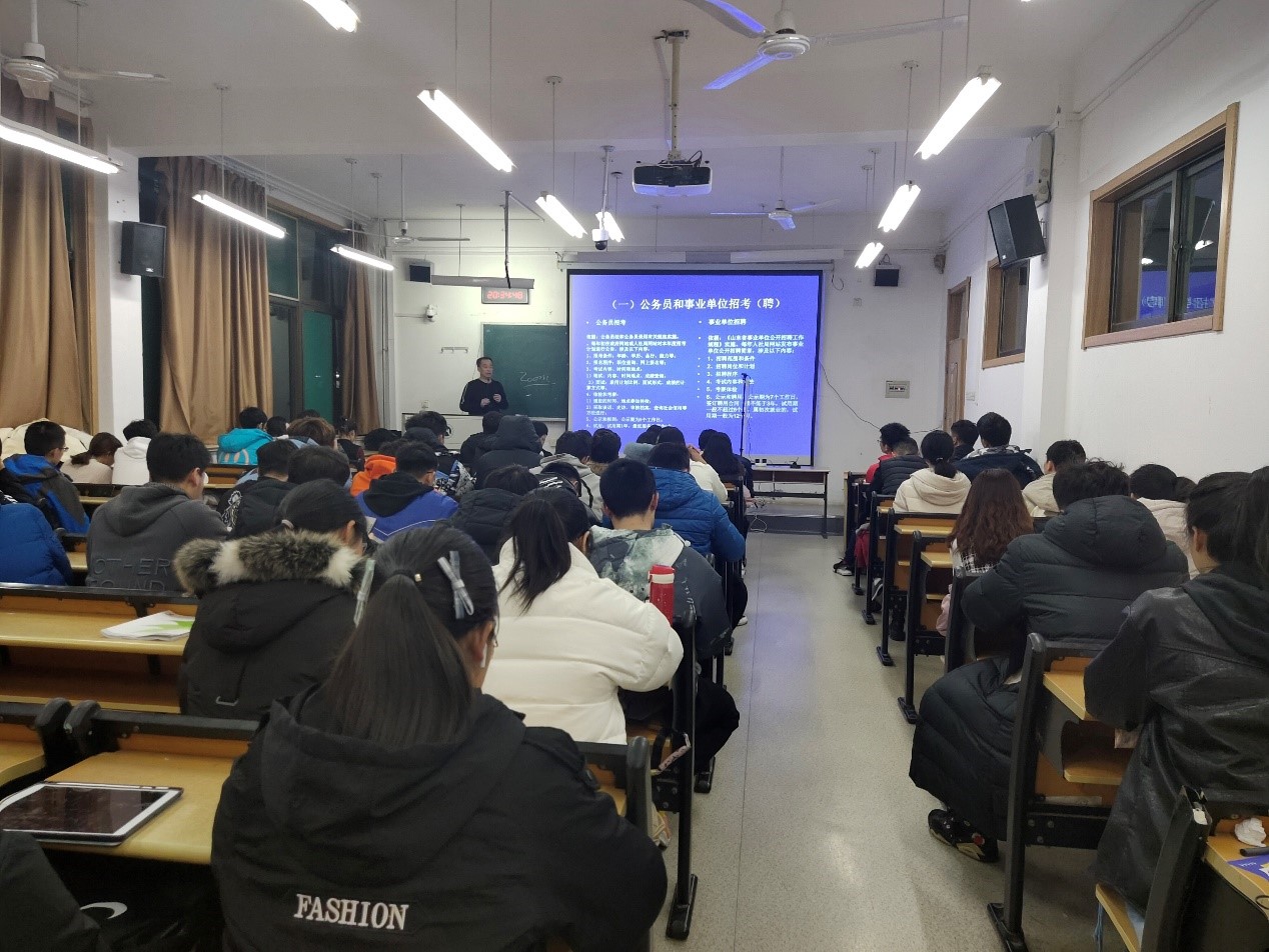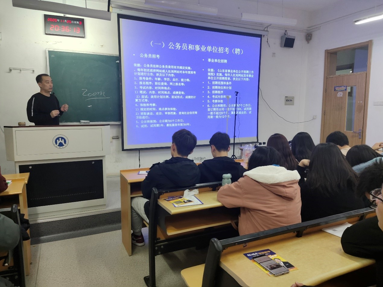 随后,李志军科长为我们详细介绍了公务员和事业单位招考、选调生选拔录用、创业担保贷款等知识,同学们系统地了解了岗位考试的内容和要求,并对在创业路上遇到的困难以及解决措施有了一个大体的认知。通过李科长的讲解,同学们更加认识到通往未来的路有许多,我们要选择最适合自己的那条。