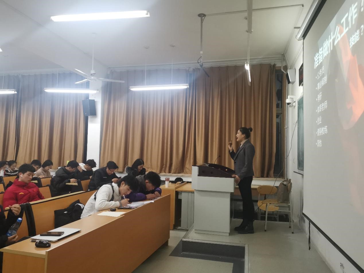 演讲过程中,李老师用T人生和π人生作比,向同学们抛出疑问:是否已有独当一面的一技之长?是否思考过未来的从业之路?引发同学们热烈讨论。并且她用自身已经考取事业编,但由于热爱体育和音乐而萌生创立属于自己的健身企业的经历,从而得出:要及时认清自己的未来目标,做好职业规划,寻找真正想要完成的事业。