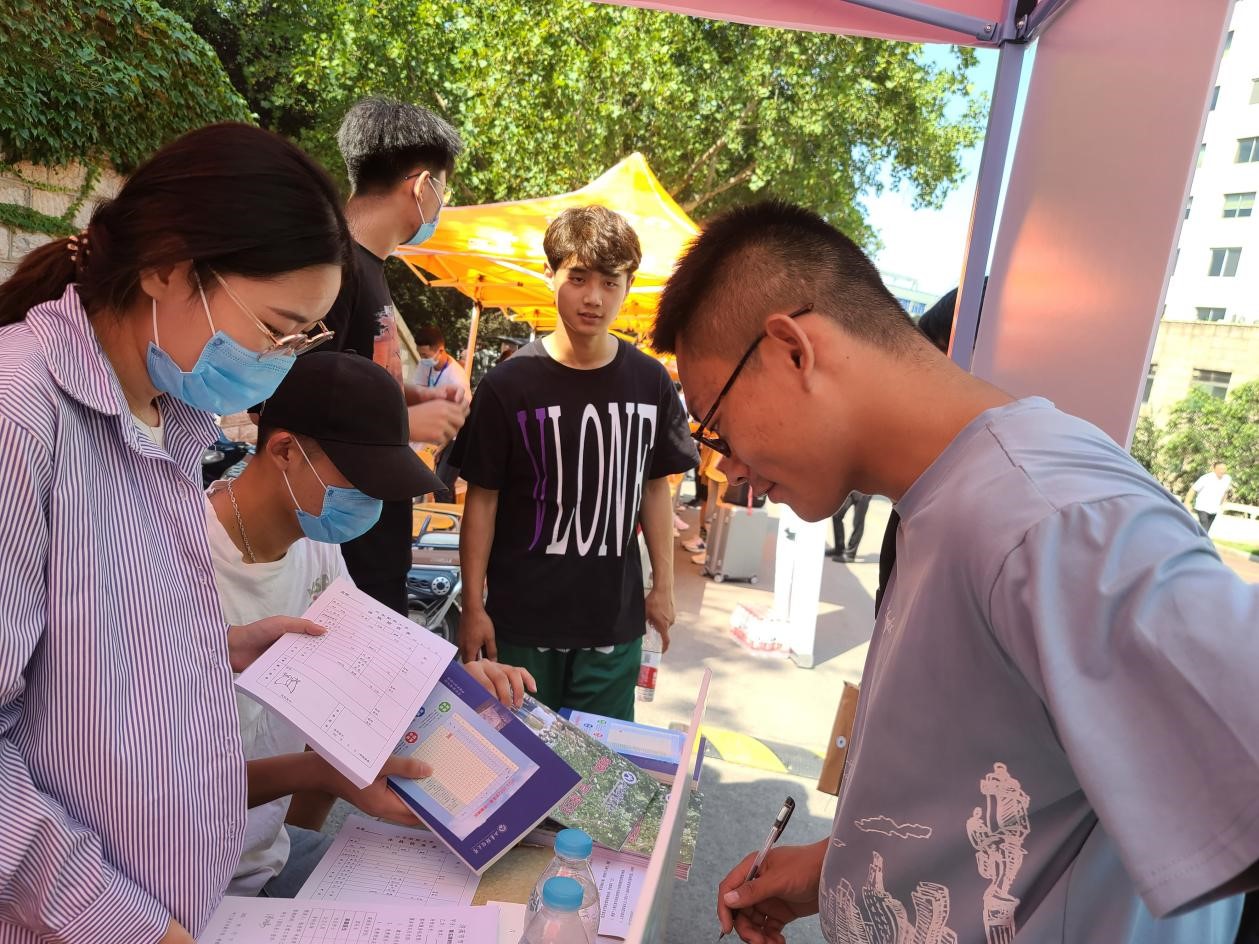 山海有距,翘首以盼,终于见到我们体育学院的新成员了!志愿者们围在新生身边,为他们详细讲解报到规范与流程,并发放材料。