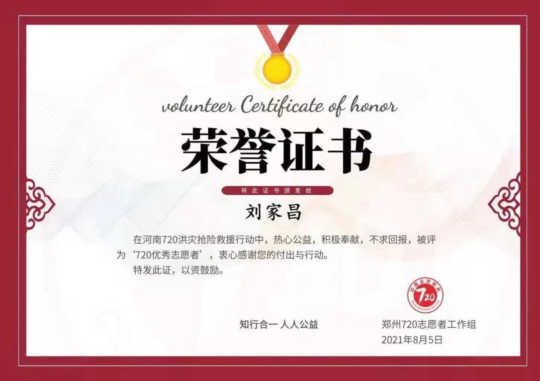 —2021级新生参加抗洪荣获“720优秀志愿者”