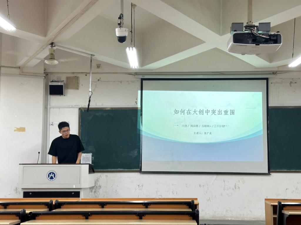 院学生会秘书处副部长、荣获2023年大学生创新训练项目国家级立项的贺广炎,介绍了大学生创新创业计划及参赛技巧,分享了他的创业之路和三千计划经验。他通过具体选题案例,强调实践项目应融合国家政策、社会热点、知识积累和社会资源,鼓励同学们将理论用于实践,服务社会。