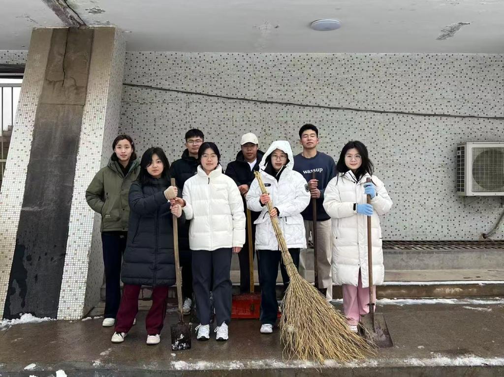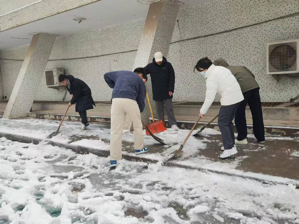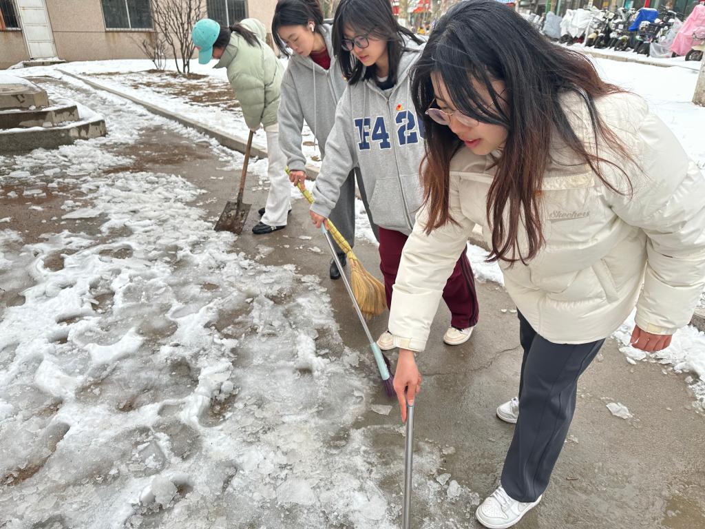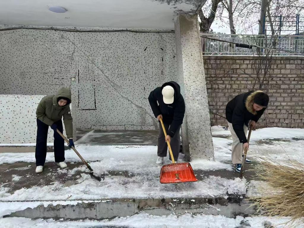 最美下雪天,最暖扫雪人。学生志愿者们纷纷拿起扫帚、铁锹等工具,积极投入到扫雪除冰工作中。尽管寒风凛冽,但他们的热情与干劲丝毫未减。同学们通力协作,干劲十足,手中的铁锹与积雪碰撞,发出清脆的声响,厚厚的积雪被一锹锹铲起;手中的扫帚不停挥舞,细致地清扫着每一处残留的雪渣与冰屑。在大家的共同努力下,原本积雪覆盖、冰冻难行的路面逐渐恢复了干净整洁,一条条安全畅通的道路重新展现,为师生出行筑起了一道温暖的防线。