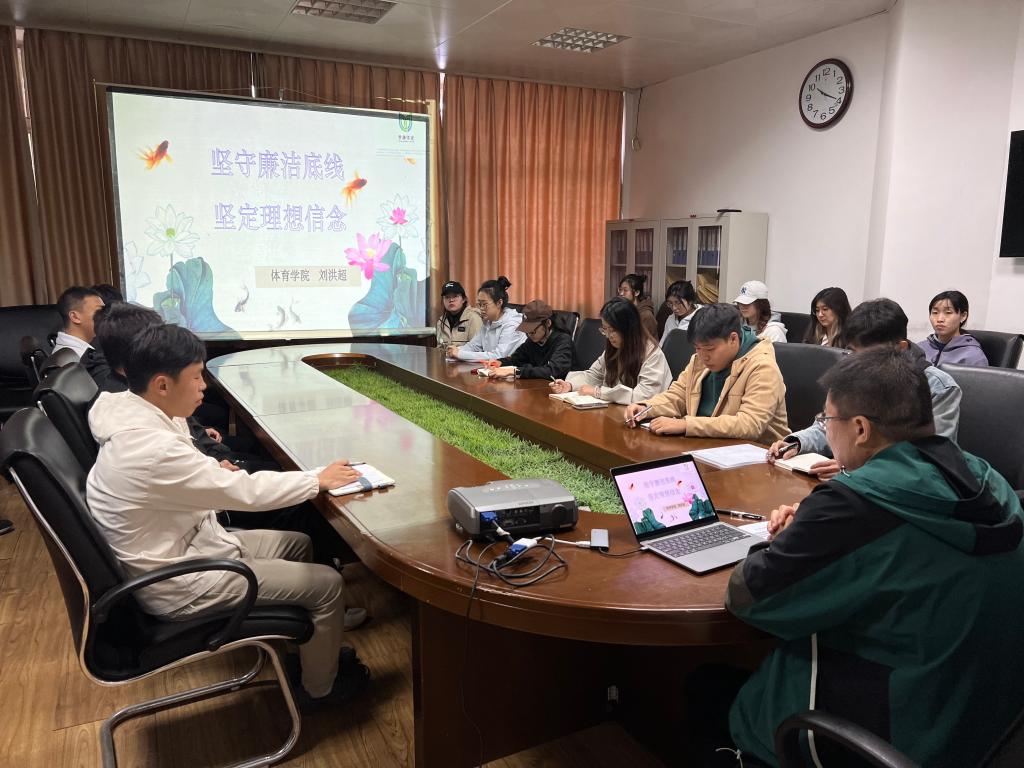 为引导大学生树立报效祖国、服务人民的信念,不断提高大学生的道德自律意识,增强拒腐防变的良好心理品质,逐步形成廉洁自律、爱岗敬业的职业观念,体育学院于11月1号上午开展青廉课堂。学工办主任兼团委书记刘洪超主讲,学生会主席团成员及各部部长参加。
