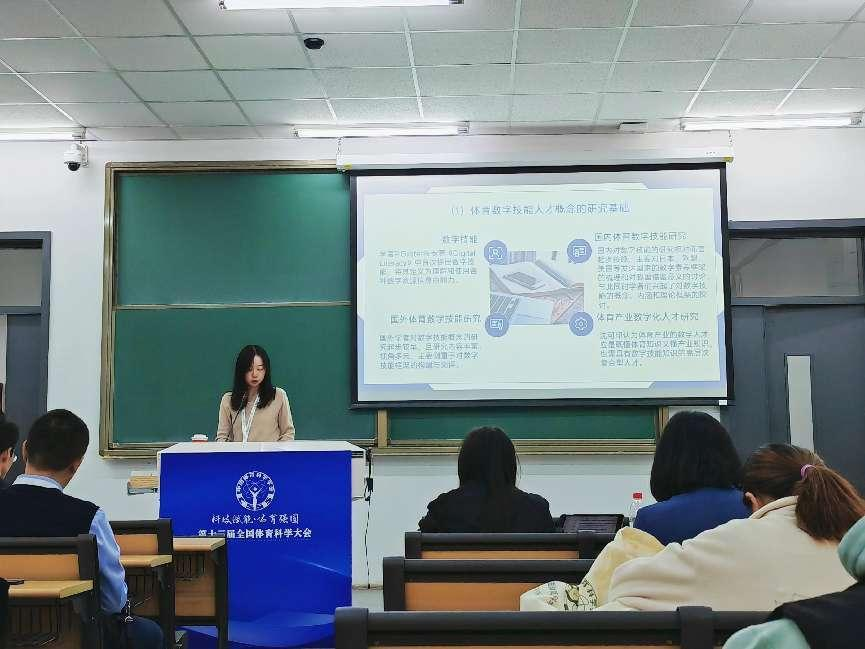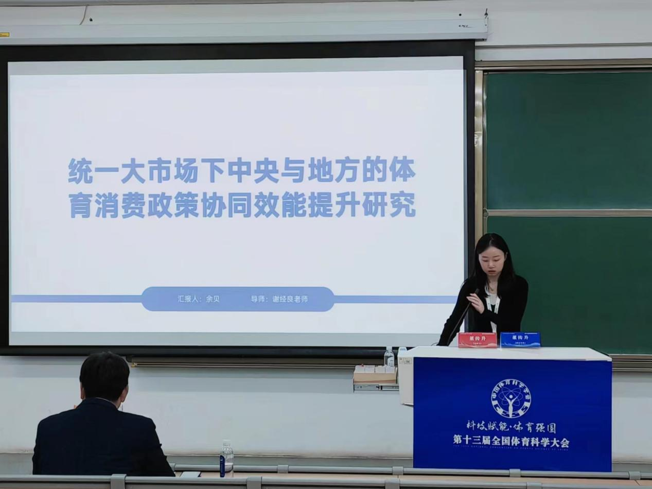 大会期间,研究生余贝参与汇报两篇专题报告。一是《统一大市场下中央与地方的体育消费政策协同效能提升研究》,报告从政策角度入手,探讨中央与地方体育消费政策协同现状,提出针对性对策,以期促进体育消费升级。二是《我国体育数字技能人才的内涵及培养的价值、困境与纾解》,报告指明当前体育数字技能人才是体育产业数字化转型的重要支撑,强调培养体育数字技能人才的时代价值,并提出政企学研协同育人的人才培养路径。会议最后,所有参会人员对科技赋能体育强国的热点问题进行了深入的学术交流和探讨,专家学者对相关问题进行解答。